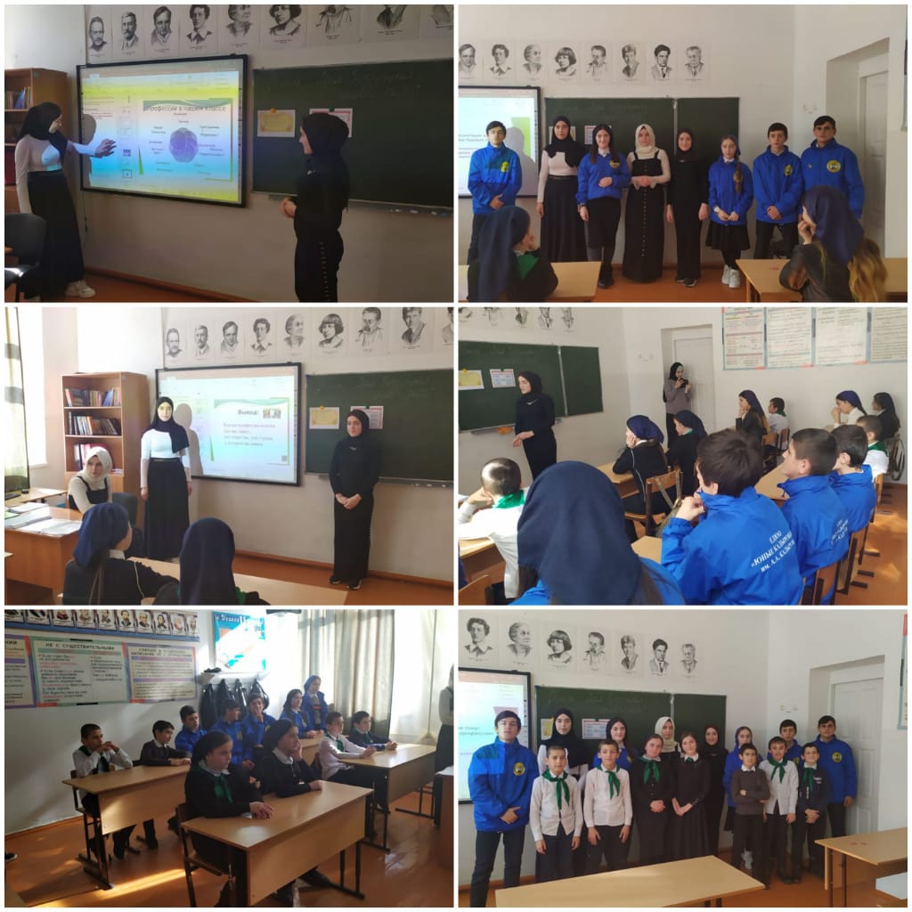 30.01.2020Сегодня зам. директора по УВР Дадаева М.У. провела мероприятие с уч-ся 5,9,10,11 классов на тему "Моя будущая профессия". Было много поучительных моментов. Уч-ся 10-11 классов показали презентацию по данной теме.