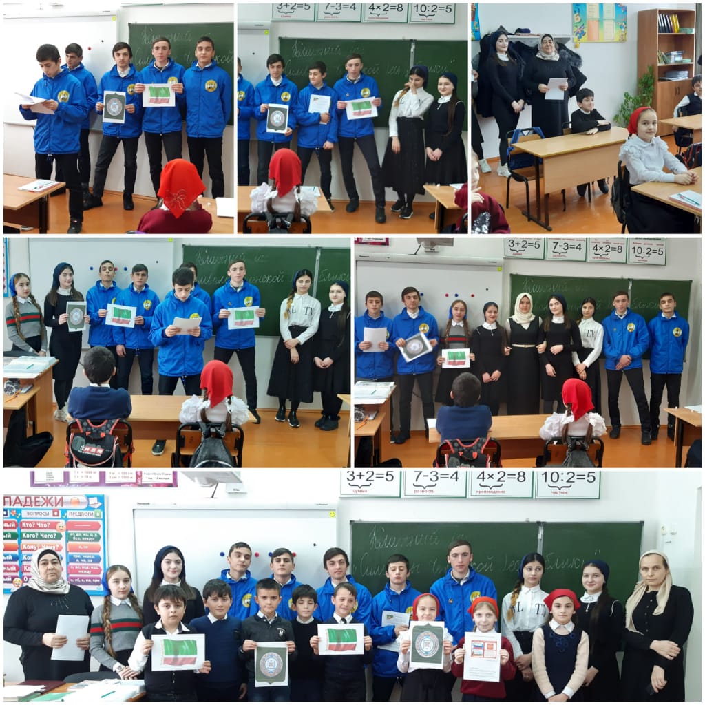 29.01.2020Сегодня ЧРОО ЕДЮО "Юные Кадыровцы" провели классный час в 4 классе на тему: "Символы Чеченской Республики".