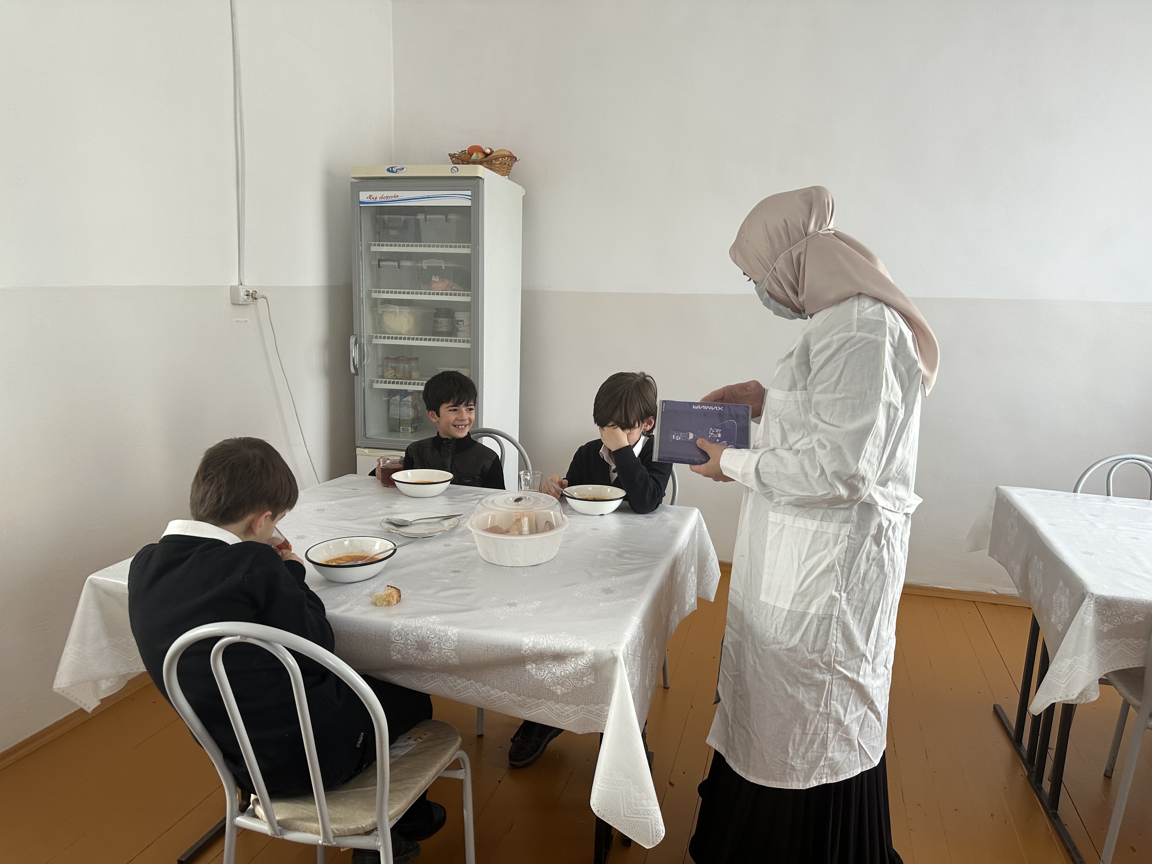 В 2025-2026 уч. году все начальные классы (100%) охвачены горячим питанием. Для полного охвата детей школьным питанием используется разъяснительная работа с учащимися на классных часах, с родителями на классных и общешкольном собраниях и проводятся индивидуальные беседы с учащимися и с родителями. Качество продуктов, находящихся на пищеблоке соответствуют установленным требованиям. Ассортимент продуктов питания и продукции разнообразен, качество готовых блюд соответствует нормам СанПиН 2.4.5.2409-08. Выпуск готовой продукции и качество завозимых продуктов питания контролируется заведующей столовой Сайдальвиевой Х.Л-А. ежедневно проводится бракераж готовой продукции. Закладка блюд - соответствует требованиям и установленным нормам. Ведётся контроль срок хранения продуктов. Продуктов с просроченным сроком хранения, нет. Мясо, куры, рыба хранятся в морозильных камерах. Пища соответствует возрастным нормам. Продукты, запрещенные к употреблению, исключены из рациона детей. В школьной столовой ведутся журналы контроля установленных санитарных норм и правил. Санитарное состояние пищеблока и залов хорошее. Пищеблок обеспечен необходимыми дезинфекционными средствами. Организация питания осуществляется в соответствии с графиком.